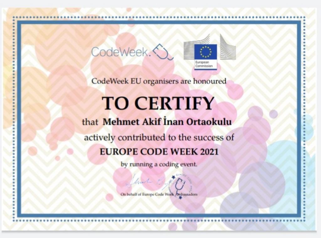 Proje kapsamında öğrencilerimizle codweek haftası için seminer düzenlendik ve katıldığımız etkinlikle okulumuza mükemmellik sertifikasını kazandırdık.Sertifikanın alınabilmesi için en az 10 farklı ülkeden okulun katılması gerekmektedir.